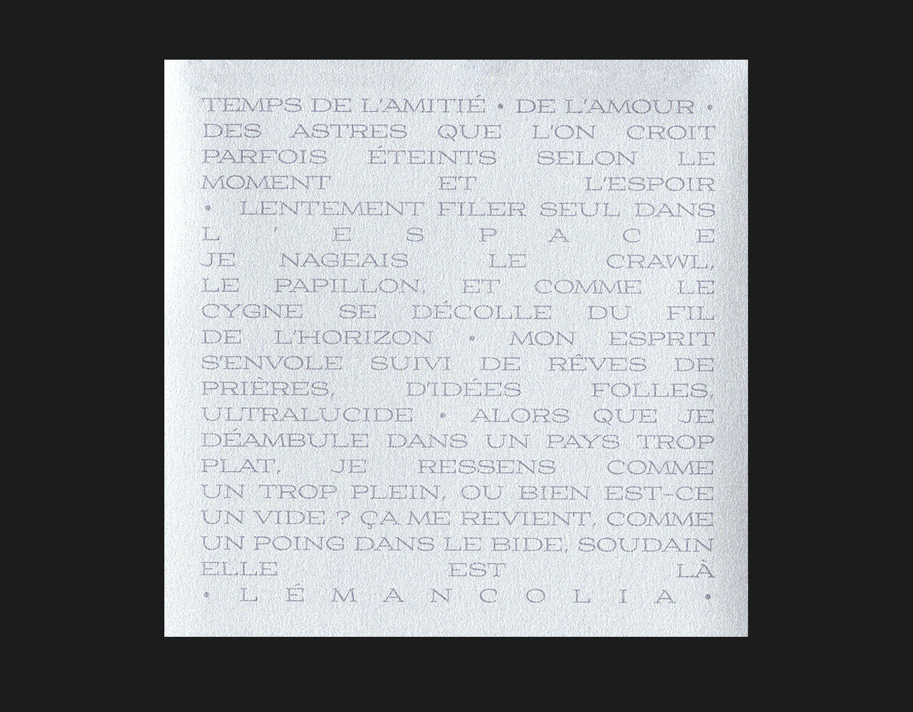 Lemancolia est un projet qui a vu le jour pendant la résidence de Cheptel à la Becque. Bâtie sur les ruines des temps modernes, inspiré par les explosions de supernova et les réverbérations du son dans les cathédrales, c'est une balade sonore de 28 minutes qui réunit sous le nom d'Azur 3000 Laure Betris de Kassette, Perrine Berger d'Adieu Gary Cooper, Léonard von Muralt aka Arléone de ChâteauGhetto, Régis lui même, Julien Israelian de Gros Oiseau à la scie musicale et Léonard Persoz du Roi Angus à la basse.